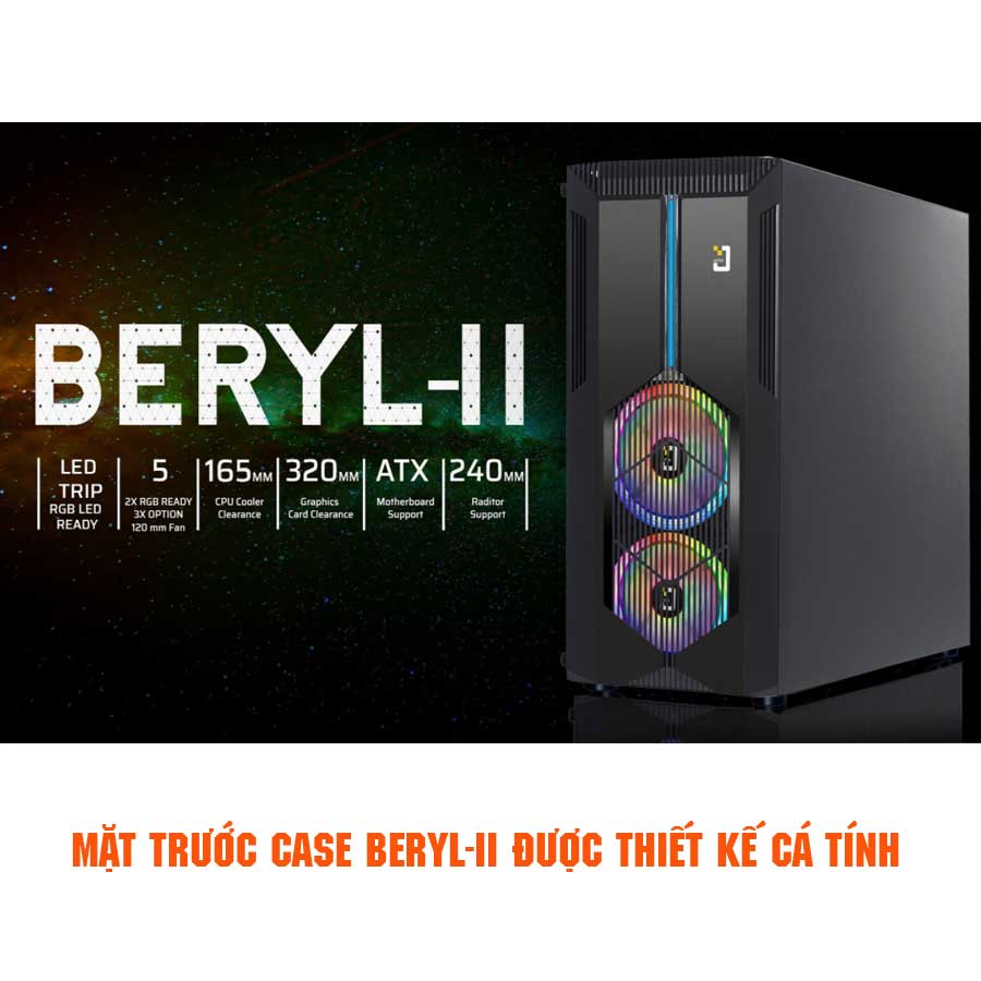 Mặt trước case Beryl-II được thiết kế cá tính, thông thoáng kết hợp với hệ thống fan đặt vị trí phù hợp, giúp nâng cao hiệu quả tản nhiệt và tạo hình khối, hiệu ứng sinh động khi PC hoạt động.